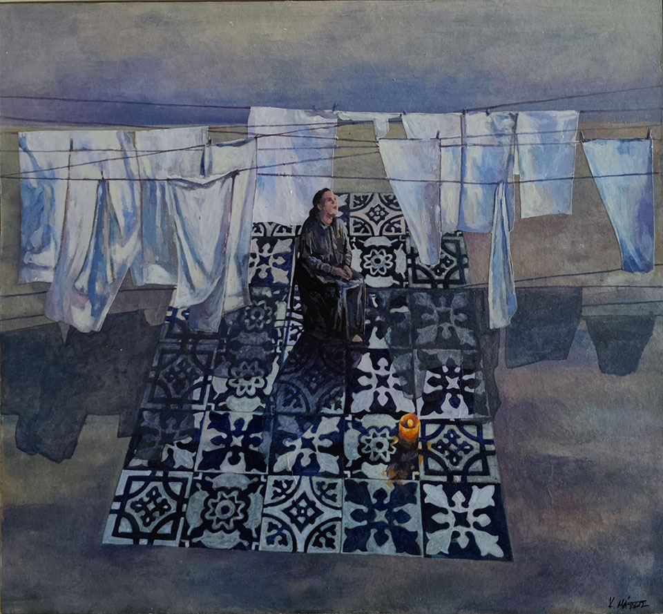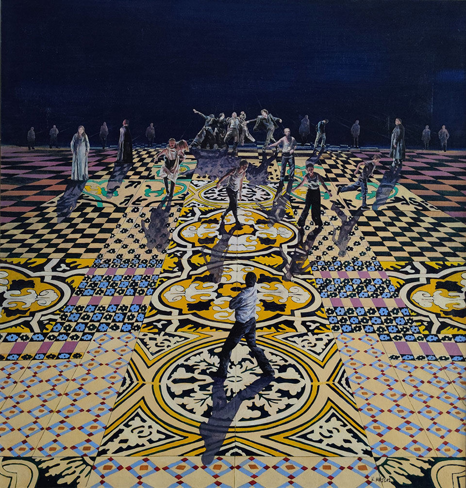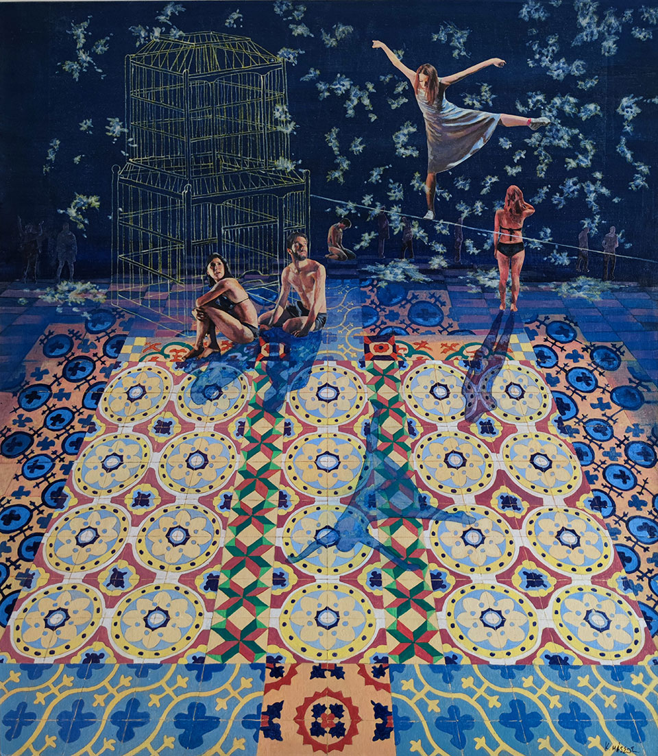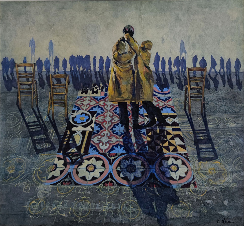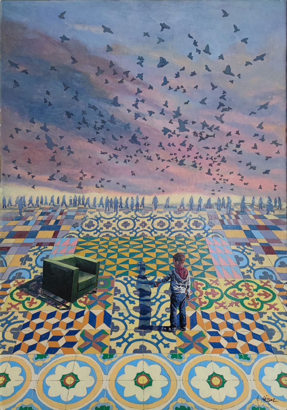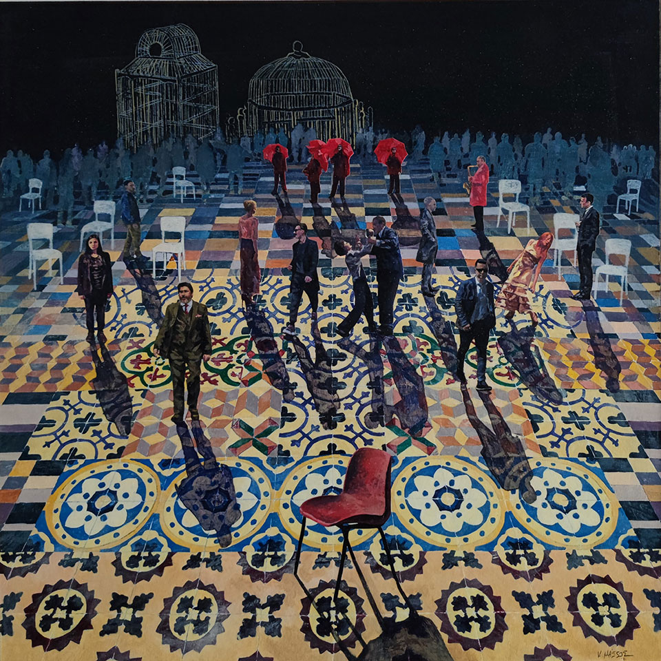Κάθε έργο του Κωνσταντίνου Μάσσου αποτελεί ένα είδος εικαστικού σεναρίου. Η μια μορφική κι ανθρωποκεντρική συνθήκη συγχρωτίζεται με μια επόμενη, χωρίς φυσικά να αποτελούν αλληλουχία. Οι μορφές συνυπάρχουν και ταυτοχρόνως αυτονομούνται. Ένα βασικό στοιχείο που τις ενώνει και την ίδια στιγμή τονίζει την ετερότητά τους, είναι τα κεραμεικά πλακάκια με τα γεωμετρικά τους επαναλαμβανόμενα μοτίβα. Τα πλακάκια αυτά προδίδουν την επαναχρησιμοποίηση του χώρου. Ενός χώρου, που η «χρονικότητά» του συνδιαλέγεται με την «διαχρονία» του και η εντοπιότητά του με την υπέρβαση. Ενός χώρου επίσης, που από εσωτερικός γίνεται εξωτερικός κι από συνειδητός περνά στο συλλογικό ασυνείδητο, οδηγώντας από την επιφάνεια σε ένα πολυεπίπεδο και διφορούμενο βάθος, όπως ισχύει κι αντιστρόφως.