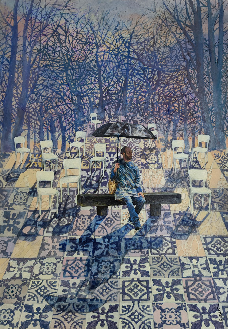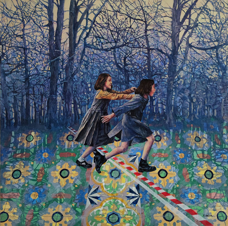 Επιπλέον, κάθε «ιστορία» εκάστου έργου αυτής της σειράς, διαμορφώνεται μέσα από μια πληθώρα περιστασιακών υποτίθεται «μικρο-ιστοριών», που λειτουργούν σαν τις υποθέσεις των αινιγμάτων, γεννώντας την «μετα-ιστορία» της κάθε φορά και διαφορετικής μυθοπλοκής, την οποία ως δομή διασυνδέει ο χωροδυναμικός και ποικιλόμορφος «τάπητας» με τα πλακίδια. Ο ρυθμοτεχνικός και πολυδύναμος αυτός «τάπητας» - που παραπέμπει στο στημόνι και στο υφάδι ενός θα λέγαμε υφαντού - νοηματοδοτεί εντέλει την «εικόνα», αφαιρώντας της ωστόσο τον συναισθηματισμό, χωρίς όμως από την άλλη πλευρά, να της μειώνει την υποκείμενη «δραματικότητα». Την ίδια μάλιστα στιγμή, ενώ αναπαραστατικά φανερώνει τα «προκείμενα» ή τις δράσεις/πράξεις του «φαίνεσθαι», παραλλήλως και αδιαφανώς ο καλλιτέχνης υπονομεύει την μονοδιάστατη (και καταναλωτική στην πραγματικότητα), εξουσία της - κατά τα άλλα παραμυθητικής - ερμηνείας της. Θωπεύει, με άλλα λόγια την «εικόνα» ο ζωγράφος, αντιστρατευόμενος τον ναρκισσισμό της. Γι’ αυτό δεν δεσμεύει το βλέμμα του θεατή και δεν κατοχυρώνει επιβεβαιωτικά καμία εύλογη «ερμηνευτική» εκδοχή, αφ’ ης στιγμής η «εικόνα» γίνεται μέσον προβληματισμού.