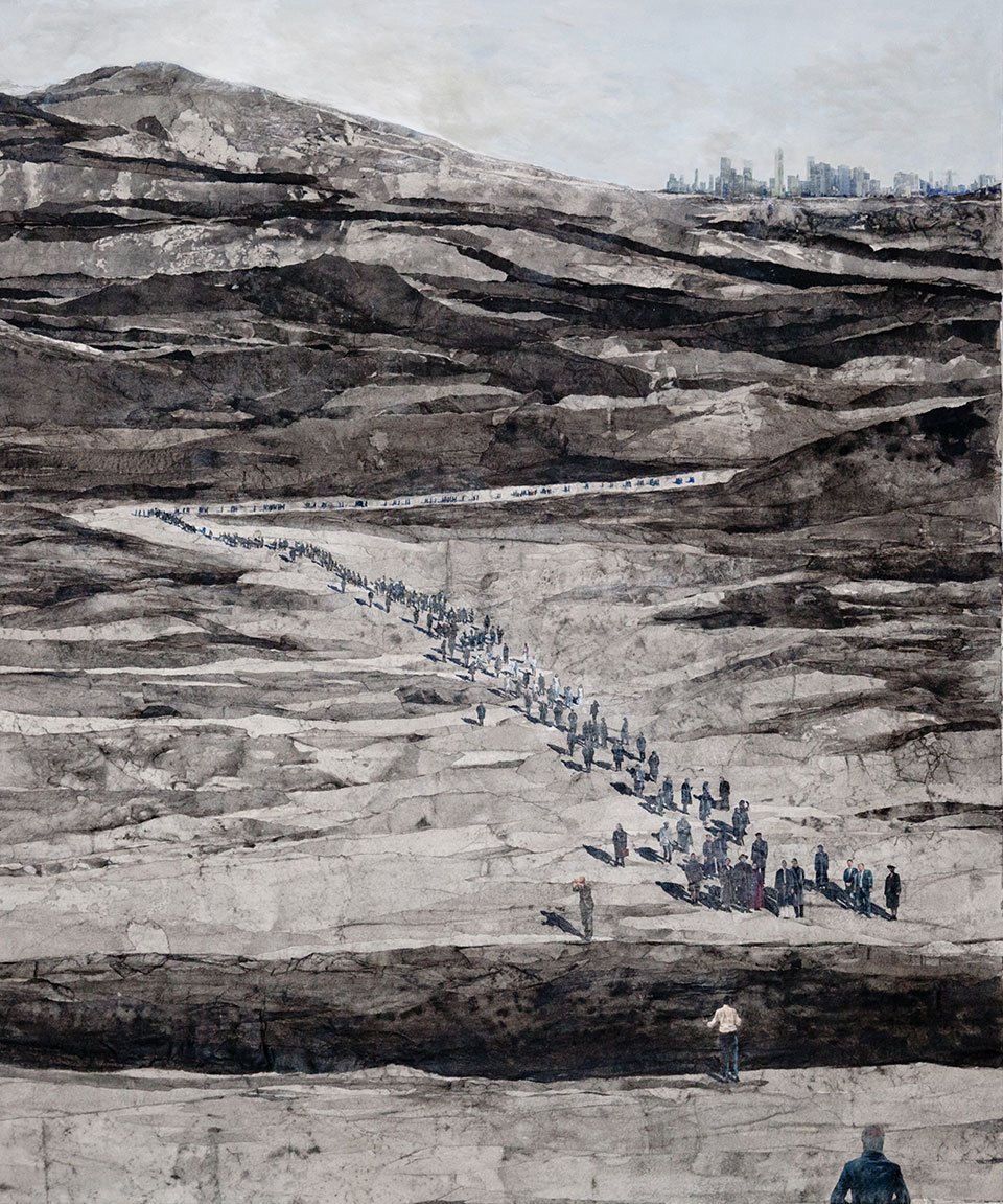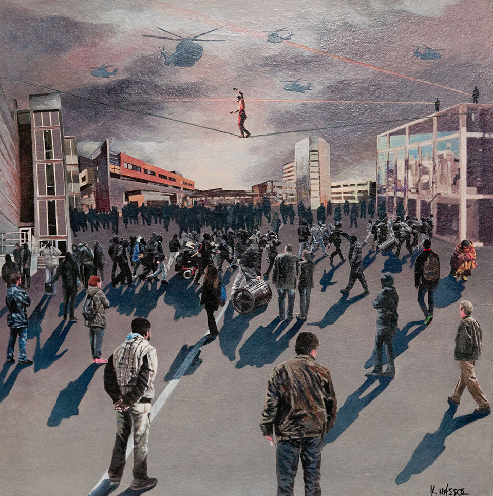 Κι όταν πια ως εγγενείς ηθοποιοί δημιουργήσουμε τη μορφή, εν προκειμένω τις πόλεις με τα τεράστια επιβλητικά κτίρια και τα πάρκα με υποψία παρουσίας νερού, αναζητούμε την ατομική ευτυχία. Στο κυνήγι της ατομικής ευτυχίας η αδιάκοπη και καθοριστική πίεση της παρουσίας του άλλου μας αναγκάζει συχνά να τον καταβροχθίζουμε ή να καταβροχθιζόμαστε από αυτόν. Χαρακτηριστικό το έργο με την φιγούρα που ακροβατεί προσπαθώντας να βρει την ισορροπία της, την ίδια ώρα που η πτώση στο πλήθος μοιάζει τόσο απειλητική όσο σε μια θάλασσα με καρχαρίες. Πώς όμως οι άνθρωποι αναζητούν την ευτυχία; Στις σκοτεινές και γκριζωπές πόλεις του Κωνσταντίνου Μάσσου οι άνθρωποι είτε μετέχουν πλήρως στη ζωή με τις σκληρότητες και τις χαρές της (επιθετικά αεροπλάνα και ελικόπτερα, μαύρα πουλιά, διαδηλώσεις, συγκρούσεις, ακροβασίες, παιχνίδια), είτε απομονώνονται. Η καθιστή φιγούρα που παρατηρεί το πλήθος να κινείται, η όρθια φιγούρα ανάμεσα στα παιδιά, η φιγούρα σε εμβρυακή στάση, διαλογίζονται, στοχάζονται, θαυμάζουν τον κόσμο και απελευθερώνονται από αυτόν. Μπορούμε όμως να κατακτήσουμε την ευτυχία; Μπορούμε να κατακτήσουμε το καντιανό numen, το απόλυτο καθεαυτό ή είμαστε περιορισμένοι στον φαινομενικό κόσμο και στη μορφή;